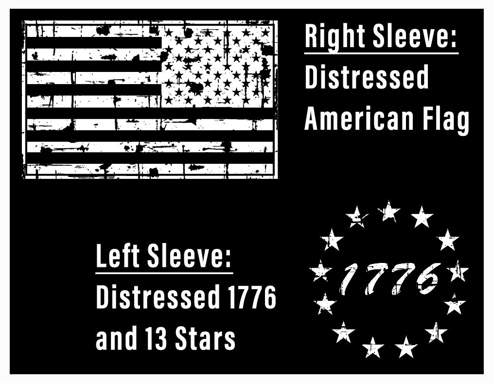 - Front design ONLY - American Flag / 1776 & 13 Stars not included.